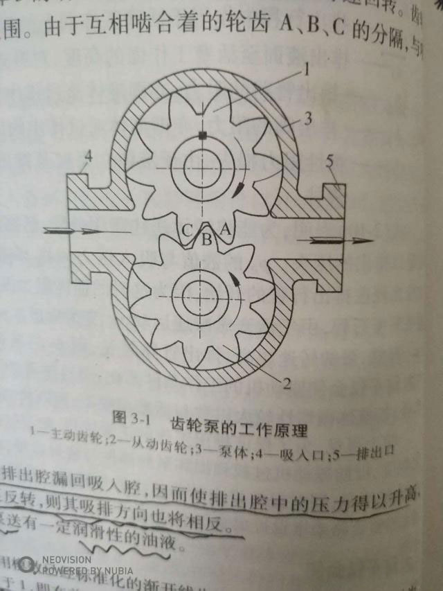 因此,當齒輪按圖示方向回轉時,齒C就要逐漸退出嚙合,其所占據的齒間容積因而增大,壓力相對降低,于是液體在吸入液面上的壓力作用下,就會沿吸入管徑吸入口4被吸入這一齒間。隨著齒輪的回轉,一個個吸滿液體的齒間陸續轉過吸入腔,并沿泵殼內壁轉移到排出腔。當各齒依次地重新進入合時,各齒間中的液體即被人字的輪齒所取代,但因齒輪之間鑒密合,泵體內壁與各齒頂之間的間涼以及兩側端蓋與齒輪兩側端面之間的間隙又都很小,有效地防止了液體自排出腔漏回吸入腔,因而使排出腔中的壓力得以升高,最后經排出口排出。顯然,使齒輪泵反轉,則其吸排方向也將相反來內擦面金,故束送有一用滑性的油液。